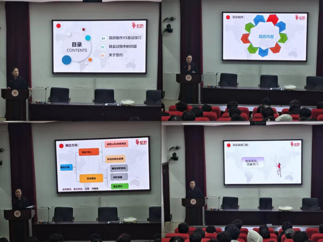 讲座中,杨陈围绕简历制作、面试技巧、就业常见问题、签约须知展开讲解,既明确了简历的核心内容与自检要点,也系统介绍了面试全流程、不同类型面试的考察重点及高频问题的应对逻辑,还结合案例给出了简历石沉大海、offer选择等就业难题的解决方案,同时解读了签约相关规则以帮助同学们规避风险。