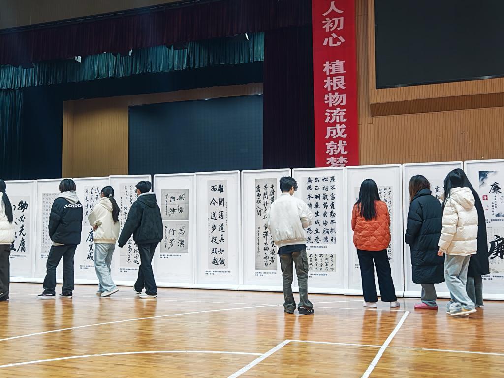 在我校选送的欧阳昌雄老师书法作品前,师生们驻足细观,凝神品味。作品以苍劲雄浑的笔法挥就,结构庄正、气韵贯通,既彰显出深厚的传统书法造诣,更以笔墨意境传递出清正廉洁的精神内核,成为整个展览中意境高远、引人深思的亮点。